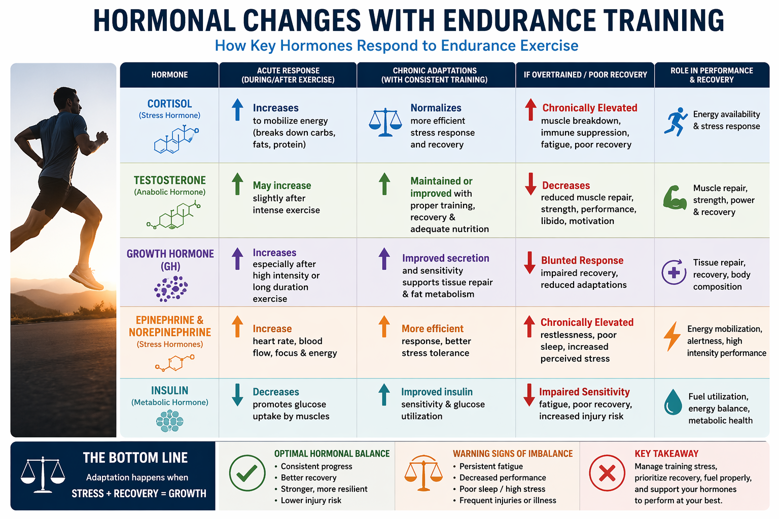 Epinephrine and norepinephrine are released during endurance training to increase heart rate, improve blood flow, and enhance energy availability. These hormones are essential for performance and allow the body to meet the demands of training. In a well-balanced program, their effects are temporary and return to baseline after exercise. However, when training stress is too high or recovery is insufficient, the body can remain in a heightened state of stress. Athletes may experience poor sleep, increased anxiety, and declining performance despite continued effort.